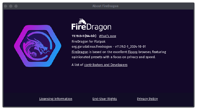FireDragon is a browser based on the excellent Floorp browser (also called the Vivaldi of Firefox’s). It was customized to have dr460nized-fitting aestetics as well as many opiniated settings by default. As this browser was originally a LibreWolf fork, we are trying to integrate its best patches and tweaks in the new base. The most important features in addition of Floorps own ones can be found below.